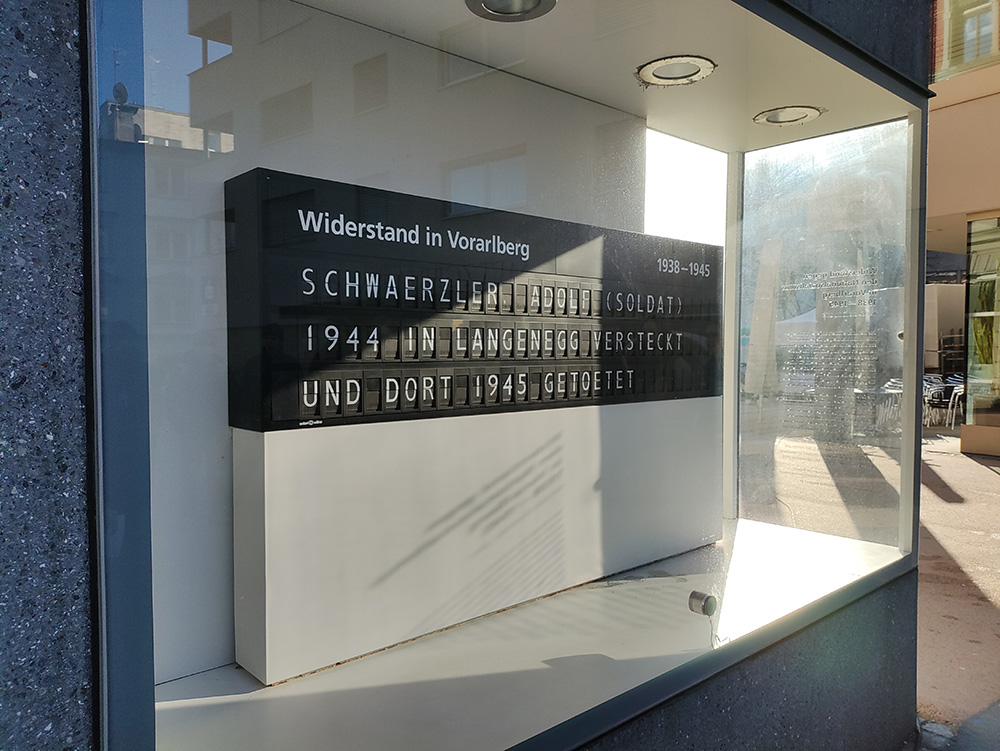 Wir trafen uns beim Widerstandsmahnmal am Sparkassenplatz, auf dem 100 verschiedene Widerstandskämpfer auf einer Fallblattanzeige dargestellt sind. Dieses Mahnmal ehrt jene Vorarlbergerinnen und Vorarlberger, die dem nationalsozialistischen Regime Widerstand leisteten, Verfolgten halfen und trotz schwieriger Umstände Menschlichkeit bewiesen.