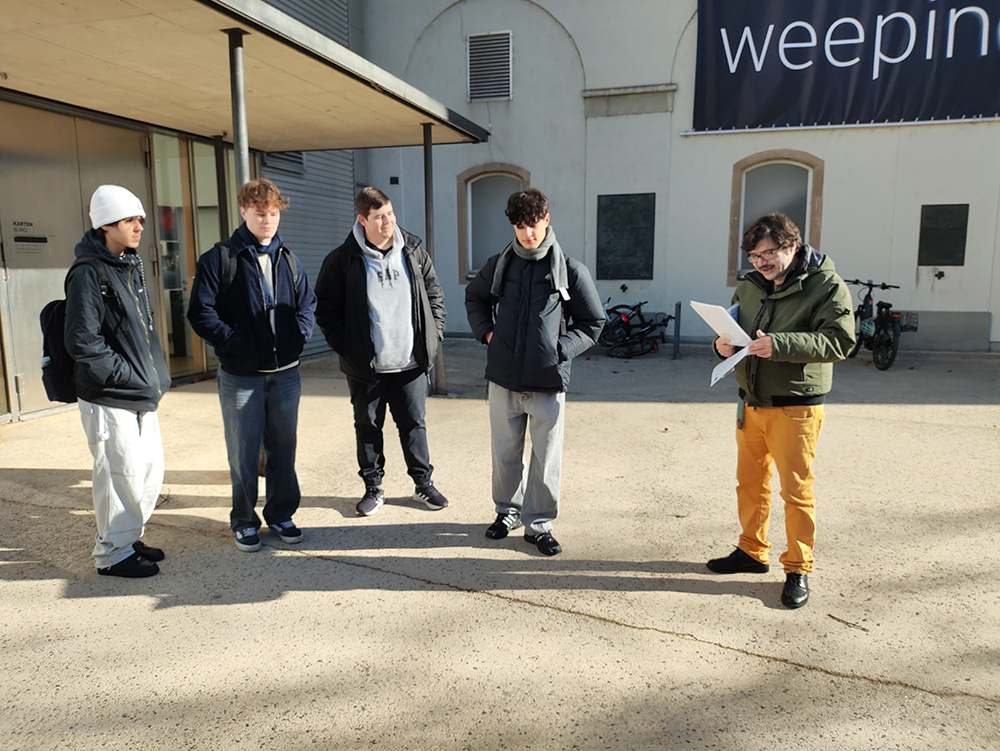 Vor dem Theater am Kornmarktplatz sammelten wir uns in Kleingruppen und definierten Begriffe wie Widerstand, Widersetzlichkeit und Deserteur. Anschließend wurde uns erklärt, wie die Nazis den Platz und das Theater für ihre Propaganda nutzten. Außerdem sahen wir uns Gedenktafeln im Stadtzentrum an und lauschten den Geschichten, die unsere Guides erzählten. Besonders erschütternd fanden wir die Tafel der namenlosen Euthanasie-Opfer und die Geschichte über die „Hungersuppe“.