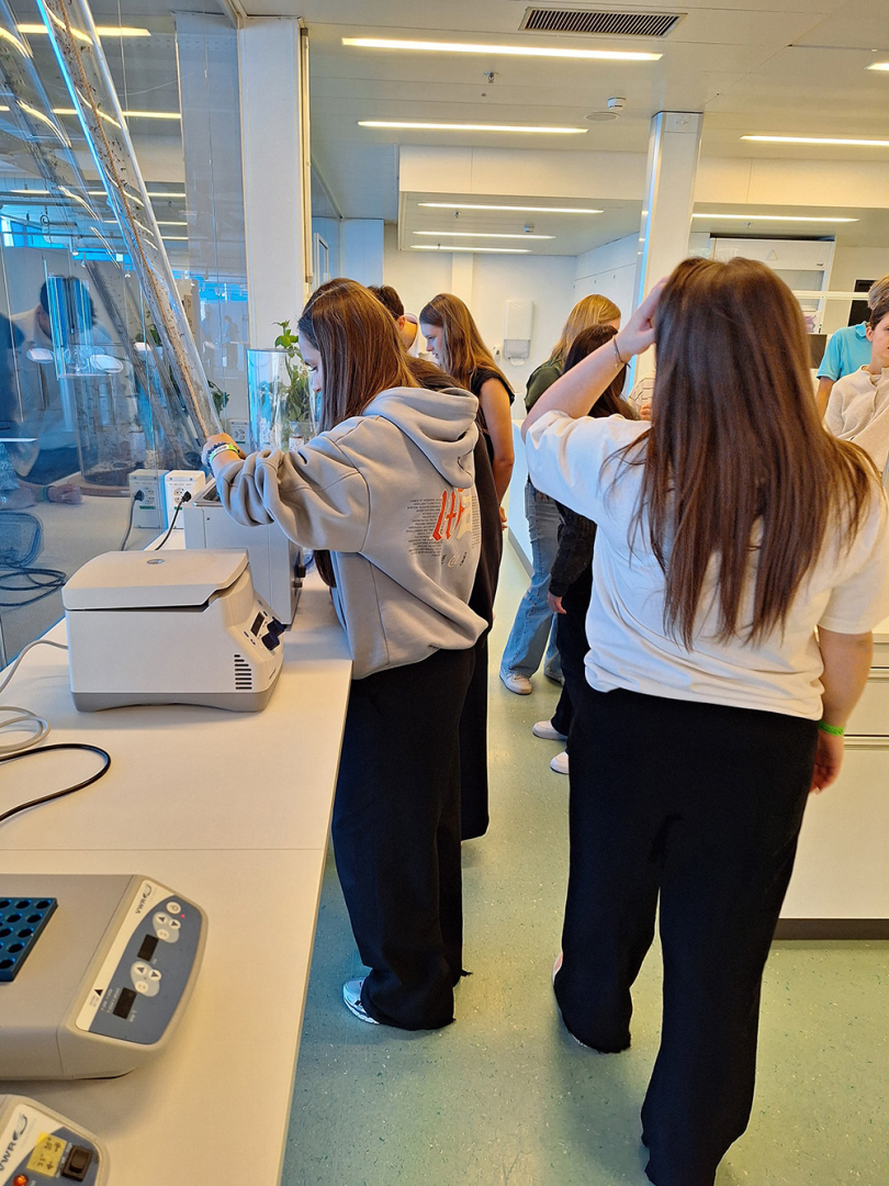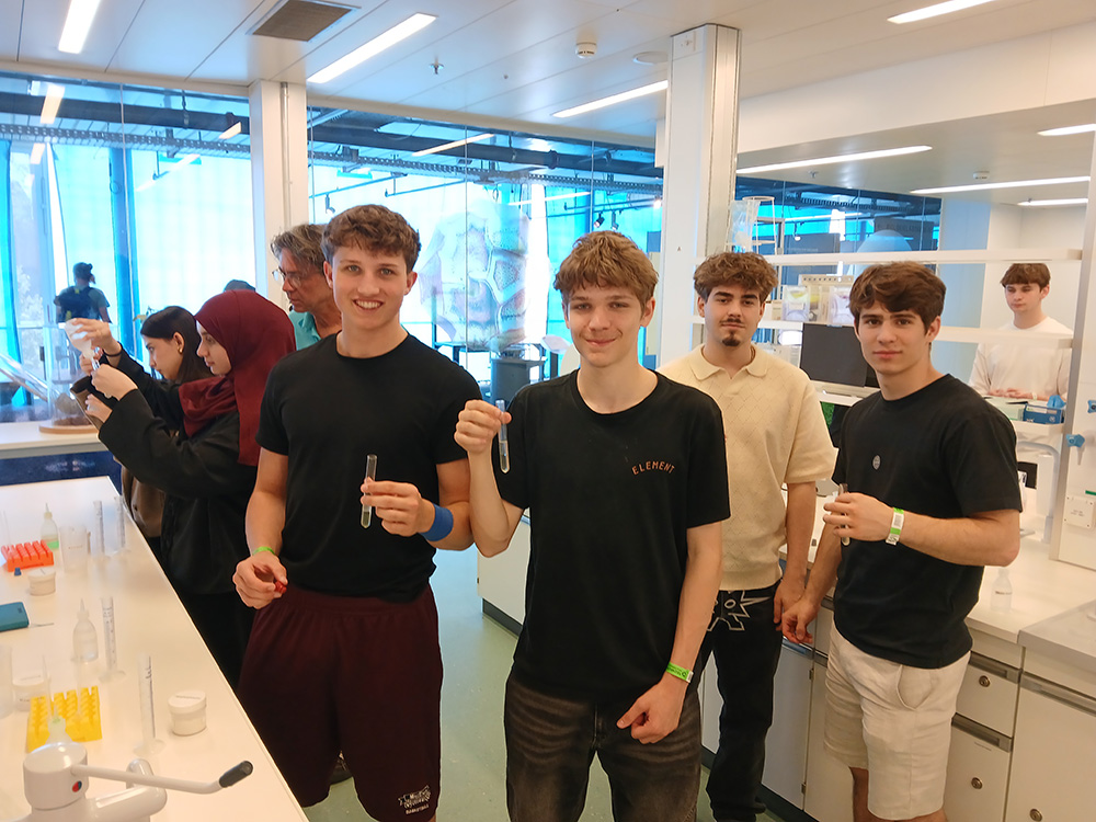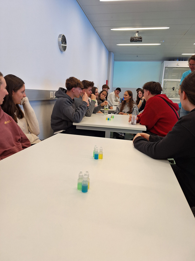Im Technorama angekommen, wartete auch schon ein spannender Genetik-Workshop auf die beiden Klassen. Nach einer theoretischen Einführung in die Grundlagen des Zellaufbaus, gaben die SchülerInnen eine Speichelprobe ab und extrahierten dann daraus mittels verschiedener Reagenzien ihre eigene DNA. Diese wurde abschließend liebevoll in Form eines Halskettchens mit Flacon verpackt.