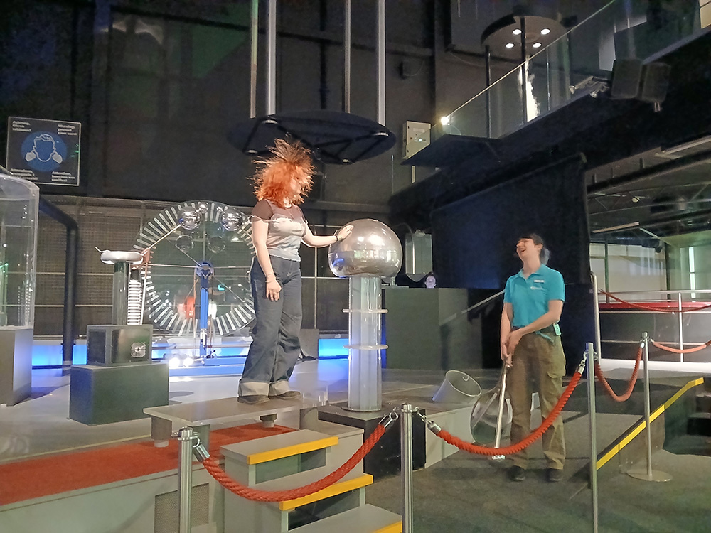 Nach diesem Schnuppern in die Welt der Molekularbiologie hatten die Jugendlichen die Möglichkeit sich selbst auf den Weg zu machen und indoor sowie auch outdoor verschiedenste Naturphänomene und auch Sinnestäuschungen live mitzuerleben. Einige Wagemutige tauchten sogar hautnah in die Welt der Physik ein und trauten sich ins Coriolis-Karussell oder in gefährliche Nähe von extremhohen Stromspannungen beim Van-de-Graaff-Generator. Auch die Magie des Wassers verzauberte so manche, vor allem im großen Außenbereich – zum Glück war das Wetter gut und das Museum mit effizienten Trocknern ausgestattet.